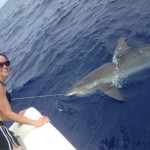 The “humps” have been very active the last week here off the Florida Keys. There’s been lots of blackfin and skipjack tuna, which means the sharks aren’t far behind! We stopped by one of the Humps the other day and we hooked 10 tunas, but were only able to get 3 in because the sharks were eating them faster than we could bring them in. Since we did catch a few tuna, I rigged up our shark rod and put a live skipjack out for bait. It only took 60 seconds to get a bite, and after a 20 minute fight we had a 7′ long, 200 lb silky shark next to the boat. After a few pictures we released the fish. It was Paul’s goal to catch a fish over 100 lbs in his lifetime, and the shark was the ticket! His wife Melissa was up next, and at 105 lbs she was in for a battle. We put out another skipjack tuna, and within minutes she was hooked up to a monster. After a 30 minute tug of war, she had a 9′ long , 300 lb dusky shark boat side! She was exhausted but ecstatic! We took a few pics and released the shark to fight another day. If you’re looking for some monster shark fishing send me an email and we’ll give it our best shot!